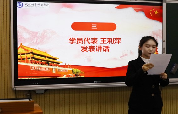 紧接着,入党积极分子学生代表王利萍同学发言,在发言中,她励志成为一名优秀的入党积极分子,成为一个有着积极思想、认真工作的学生,并带领着广大同学一起为学院发展做贡献。