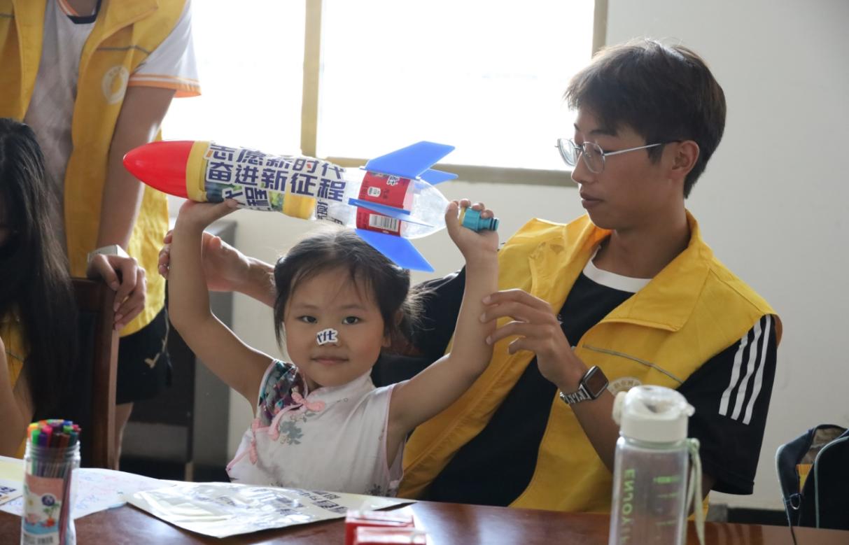 为树立乡村环保意识和激发科学探索的兴趣,“薪传跃动”志愿服务队带领乡村留守儿童,用课余时间收集的废弃塑料瓶、纸板等材料,制作充满科技与奇思的水火箭。在队员们的悉心指导下,孩子们从零开始,学习原理、裁剪组装、装饰美化,每一步都充满了新奇与认真。小小的火箭凝聚着孩子们的创意与期待,洋溢着专注而热烈的氛围。