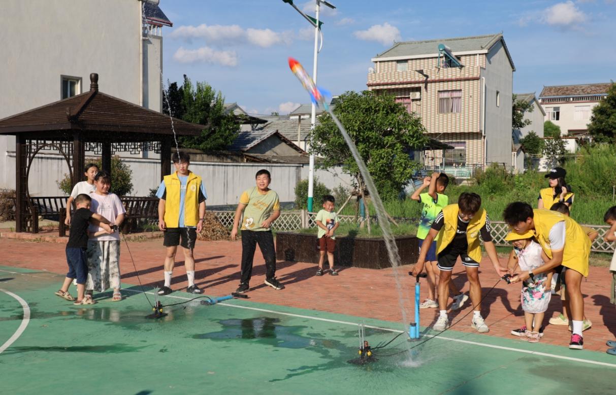 科技点亮梦想,水火箭划破乡村长野。8月23日武汉城市职业学院职业网球学院“以体筑梦,健体兴乡”乡村振兴社会实践活动为徐畈村带来了科技环保手工——水火箭实践课,数枚色彩斑斓的“水火箭”拖着长长的尾迹,呼啸着划破长野,用水花与童真绘制七彩乡村的画卷。